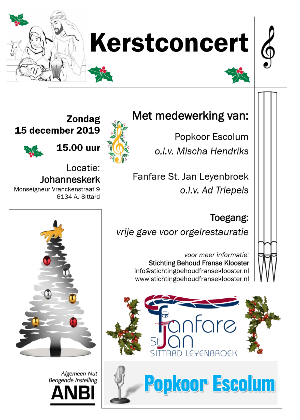 Zoals u ondertussen al enkele jaren van ons gewend bent, zal Fanfare Sint Jan haar muzikale steentje bijdragen aan dit concert. U kunt een voorproefje van ons nieuwjaarsconcert verwachten, afgewisseld met kerstmuziek. Dit jaar zoeken wij de samenwerking met onze concertpartner, Popkoor Escolum (o.l.v. Mischa Hendriks) en zullen wij samen een muziekwerk ten gehore brengen.