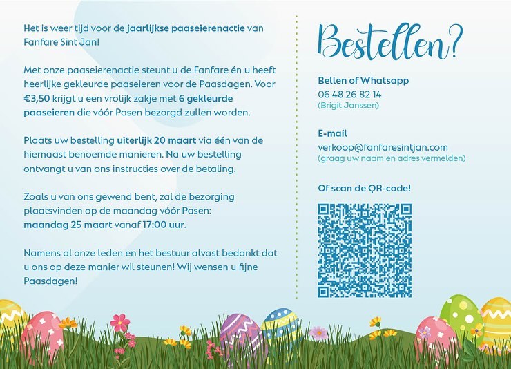 Fanfare Sint Jan bezorgt paaseieren op bestelling. Iedereen die graag paaseieren wil kopen bij de fanfare, kan t/m 20 maart een bestelling plaatsen. Dit kan zowel telefonisch als via email.