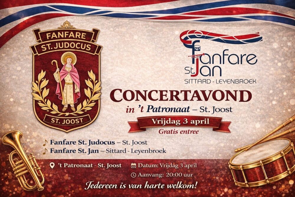 Op vrijdagavond 3 april zijn wij te gast bij fanfare St. Judocus in Sint Joost voor een gezamenlijk voorjaarsconcert. Om 20:00 uur opent de fanfare van Sint Joost de avond, waarna het rond 20:45 uur de beurt is aan fanfare Sint Jan. Iedereen is van harte uitgenodigd om te komen kijken en luisteren in ‘t Patronaat in Sint Joost (Caulitenstraat 6). Entree is gratis!
