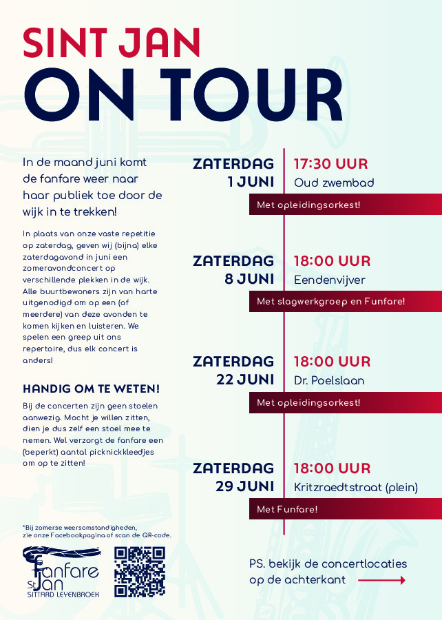 In juni gaat de fanfare weer ‘on tour’! In plaats van onze wekelijkse repetitie op zaterdagavond, trekken wij de wijk in om ons publiek op te zoeken.