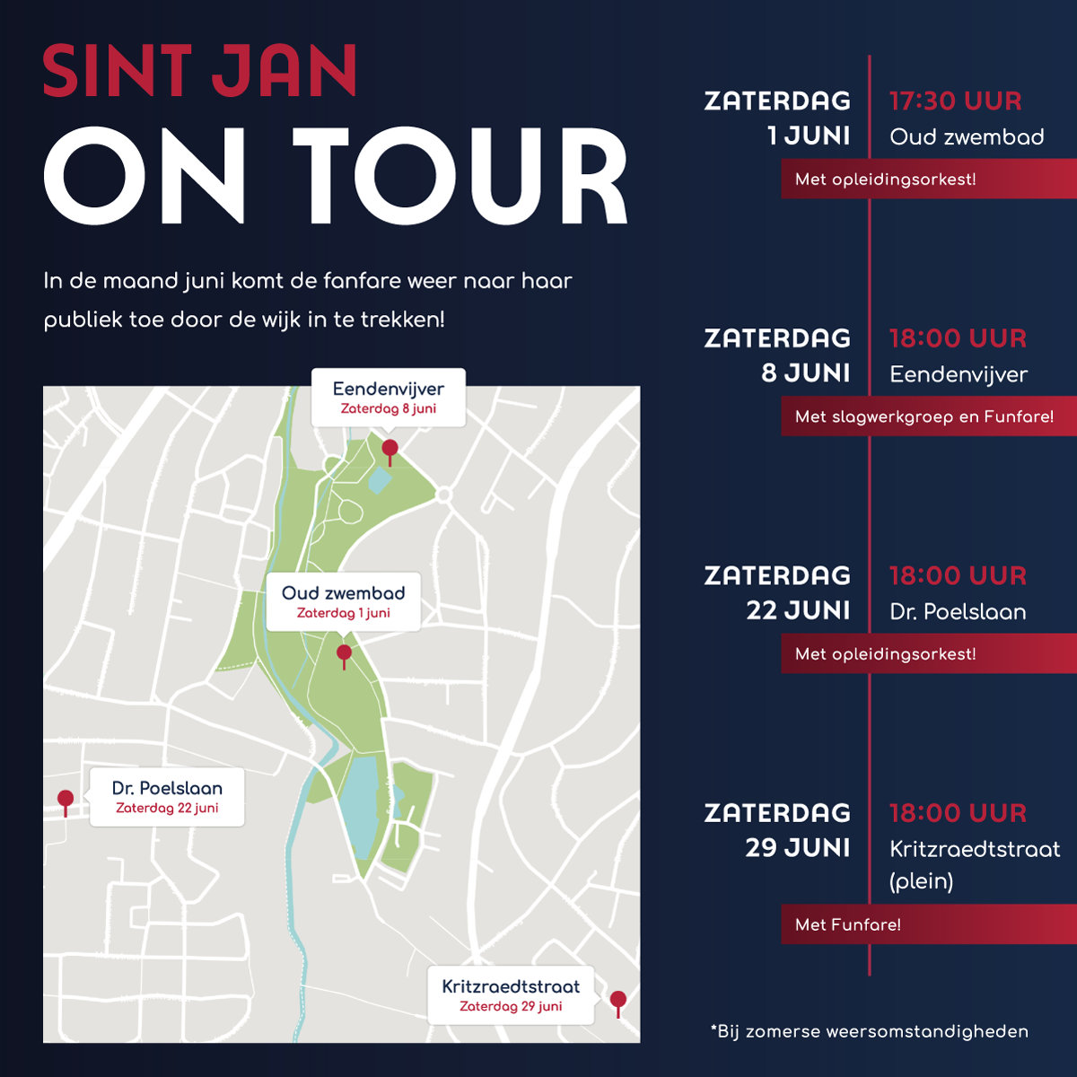 Zaterdag 1 juni is de aftrap: vanaf 17:30 uur zullen wij bij het oude zwembad in het park klaarzitten om muziek te maken. Deze locatie leent zich er uitstekend voor om lekker in de zon (hopelijk!) op een kleedje in het gras te genieten van de klanken van onze fanfare. Ook ons opleidingsorkest zal acte de présence geven tijdens deze eerste tourdag!