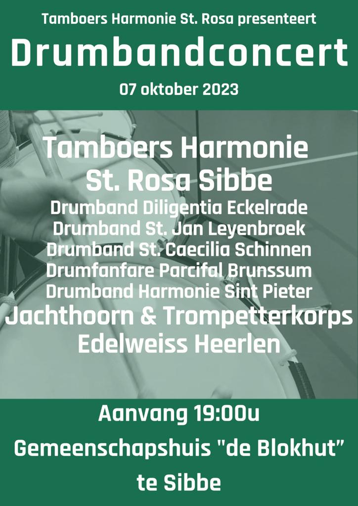 Op zaterdag 7 oktober geeft onze slagwerkgroep i.s.m. de slagwerkgroep van fanfare Sint Caecilia Schinnen een concert in Sibbe. Tamboers Harmonie St. Rosa Sibbe organiseert een avondvullende concertavond waar maar liefst 7 verenigingen aan deelnemen. De avond begint om 19:00 uur en vindt plaats in gemeenschapshuis “de Blokhut” in Sibbe (Sibberkerkstraat 49, Valkenburg). Uiteraard hopen […]